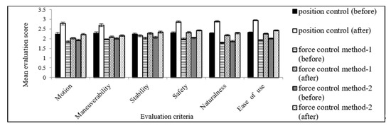 We think that the higher power assistance (Figure 12) of the position control is one of the reasons behind its superiority. For manipulating objects from one location or position to another location or position with power assist, usually, the positional inaccuracy causes problems, and thus the accuracy seems to be more expected. In addition, human users perceive and/or realize robotic system characteristics and performance generated through positional commands more ergonomically, comfortably, intensely, and realistically [7]. In addition, the position control strategy seems to be able to compensate various dynamic effects, such as inertia, friction, and viscosity, in system configurations, which cannot be compensated easily through force controls. We believe that the mentioned dynamic effects and resulting nonlinear forces may have an impact on the system configurations and performance for force controls, especially the force controls of multi-degree-of-freedom systems. However, these types of dynamic effects are not to be so significant for position controls [21,22,28]. All these factors have favored the position control over its counterparts (force controls).