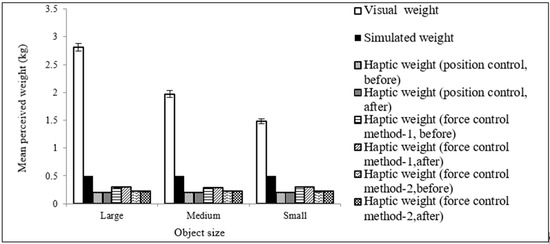 For each size object and for each control scheme/method, we computed the mean haptic weights separately for the case of experiment 2 (after the modification of the control schemes), and then compared the results with those obtained for the case of experiment 1 for the visual and simulated object weights. The obtained comparative results are exhibited in Figure 12. The obtained results reveal that the power-assist-lifted weights (the haptic weights), on average, were about 58%, 50%, and 40% of the simulated weights for force control scheme/method 1, force control scheme/method 2, and the position control scheme/method, respectively. These findings indirectly indicate 42%, 50%, and 60% of power assistance obtained in object lifting/manipulation for force control scheme/methods 1 and 2 and the position control scheme, respectively [7]. The results also reveal that, on average, the haptic weights were about 10%, 14%, and 19% of the visually perceived weights of the large, medium, and small objects, respectively. We mentioned the possibility of such findings in Section 3 while introducing our weight perceptual hypothesis. The obtained results thus justify that our hypothesis is true. The obtained results also reveal that the novel adaptive control scheme/algorithm in experiment 2 did not change the haptically perceived weights, which in turn indicates that the novel adaptive control algorithm did not have an adverse impact on the relationships expressed in Equation (3), which was in line with our expectations. The obtained results also reveal that the haptically perceived weights for the position control scheme were lowest/smallest among the three (3) control schemes/methods, indicating that the position control scheme produced the best/highest system performance because of the lowest haptic weights (i.e., because of the highest power assistance). In the same way, the perceived haptic weights for force control scheme/method 2 were found to be lower than those for force control scheme/method 1. We assume that the lower haptic weights (the corresponding higher power assistances) for force control scheme/method 2 over force control scheme/method 1 produced a better system performance for force control scheme/method 2. We conducted ANOVAs that showed that the variations in the haptic weights between object sizes were not statistically significant (p > 0.05 at each case). The probable reasons might be that the human subjects attempted to estimate the perceived haptic weights based on their haptic senses, and the visual object sizes or the visual cues had no or little influences [20]. We also found in the ANOVAs that the variations in the haptic weights between the human subjects were not statistically significant (p > 0.05 at each case).