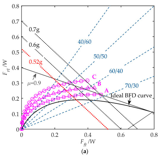 The dynamic left handbrake lever force, the front braking force calculated from the measured pressure, and the rear braking force during braking are used to plot the BFD curves as shown in Figure 13. There are three performance metrics for the BFD curve concerning braking performance and driving comfort: Pa, Pb, and Pc. The dimensionless rear braking force Frt/W at point Pa represents the dimensionless delaying force of the front brake. A sufficiently large value of Frt/W at point Pa can avoid the occurrence of rollover accidents caused by the front wheel locking first for all road conditions and help lower the motorcycle’s pitch rate on low braking forces operation, thus improving driving comfort. It is the professional drivers’ opinion through subjective evaluation that the optimal dimensionless delaying force Pa for the studied motorcycle is within 0.08 < Frt/W < 0.1 at laden load. The tested result is within an average of 0.09, which agrees well with the requirement.