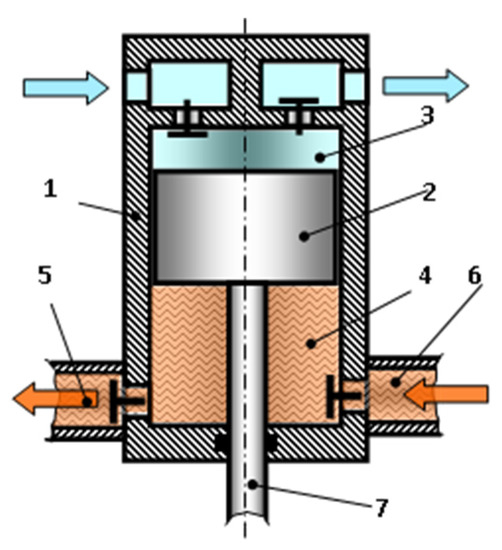 Construction diagram of piston hybrid power machine (PHPM). (1—cylinder; 2—piston; 3, 4—compressor and pump chamber; 5, 6—discharge and suction liquid nozzles; 7—plunger).