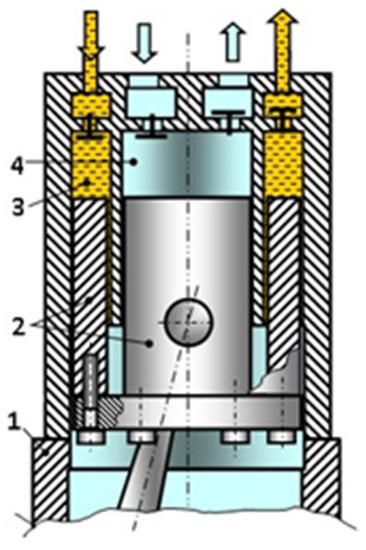 Construction diagram of crosshead-free PHPM (1—crankcase; 2—piston; 3—pumping working chamber; 4—gas working chamber).