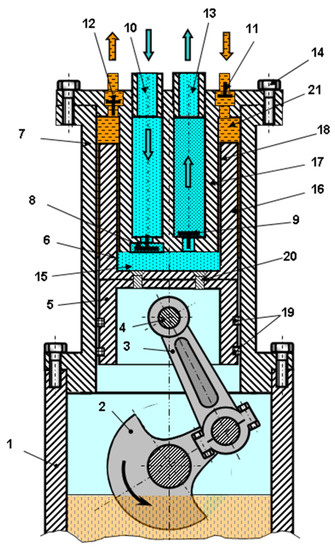 Scheme of longitudinal section of crosshead-free PHPM test model. 1—crankcase; 2—crankshaft; 3—connecting rod; 4—piston pin; 5—piston; 6—cylindrical surface of the working chamber of the compressor section; 7—outer cylinder; 8—suction valve of the compressor section; 9—discharge valve of the compressor section; 10, 13—channels for supplying and removing compressible gas; 11—suction valve of the pump section; 12—pressure valve of the pump section; 14—inner cylinder attaching to the outer cylinder; 15—working chamber of the compressor section; 16—annular П-shaped protrusion of the piston; 17—inner cylinder; 18—working clearance; 19—O-rings; 20—screw; 21—working chamber of the pump section.