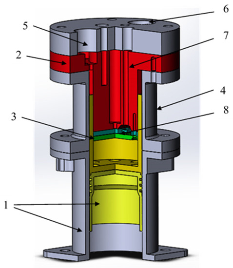 Three-dimensional (3D) image of the layout of the test model of a piston hybrid machine. 1—piston unit of the base compressor; 2—inner cylinder; 3—annular П-shaped protrusion of the piston; 4—outer cylinder; 5—pump cavity suction lines; 6—pump cavity discharge lines; 7—compressor section discharge lines; 8—valve body of compressor section.