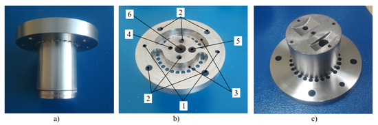 Inner cylinder: (a) assembled with the valve body, (b) top view, (c) bottom view. 1—holes for positioning pins; 2—fixation holes; 3—holes into the pump section; 4—channel to the discharge valve of the compressor section; 5—channel to the suction valve of the compressor section; 6—hole for assembling the instant pressure sensor in the compressor section.