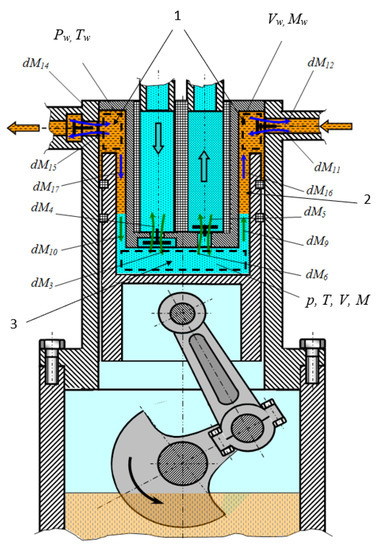 A method was developed in [20] for calculating the processes of discharge and suction based on the first law of thermodynamics for an open moving thermodynamic system.