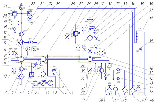 At present, one of the main ways to increase the work efficiency and effectivity of compressors and displacement pumps, as well as to improve their weight and size indicators, is to unite them into a single unit called a piston hybrid power machine. Piston hybrid power machines have the leading role among variety of hybrid power machines. When a pump and a compressor are combined into a single power unit, the compressor cooling is improved, leaks and overflows of the compressed gas are eliminated in the cylinder–piston group, friction forces are reduced in the cylinder–piston group, positive suction head is increased, and gas compression heat is to be utilized in the pump section [4]. There are two main line diagrams among hybrid power machines.