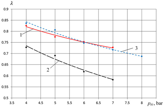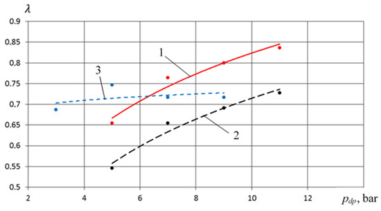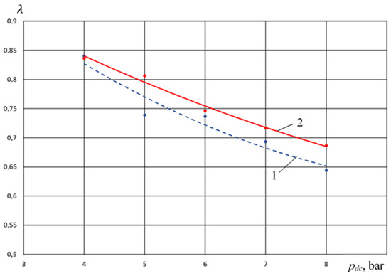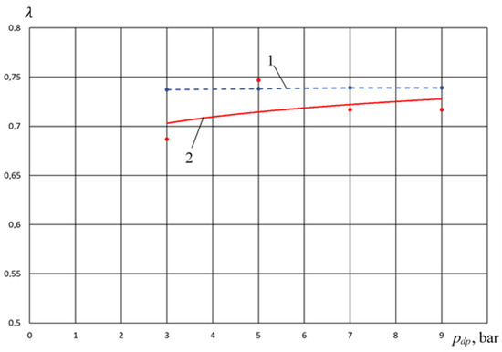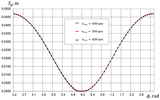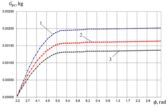 The value of the liquid temperature can be considered constant and equal to the temperature of the liquid in the pump section. The heat transfer coefficient is a variable at each point on the surface of the working chamber. While calculating the averaged over the surface heat-transfer coefficient that has been adopted, its value is determined experimentally based on [6,15,16]. While determining the mass flows through the valves, the Bernoulli equation is used with the introduction of correction factors to consider the compressibility of gases. Movement of the blocking element is considered as unsteady movement of a material point with effective mass. Movement of the blocking element is plane-parallel, perpendicular to the seating under the influence of differential pressure and spring [17].