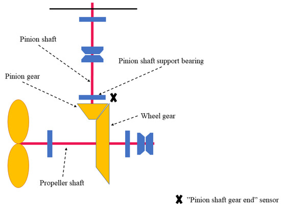 As was mentioned in Section 1, the commonly damaged components include bearings and gears. In this study, the monitoring is focused on the pinion shaft support bearing and the gear system consisting of pinion and wheel gears, which are located near the selected sensor, as presented in Figure 1. In order to identify the response from different components in the multicomponent system, it is important to identify the frequency components in the signals. The mathematical relationships between the kinematic properties of rotating components and frequency content are well documented, in bearings, for example in [20]. The frequencies of interest in this study are therefore summarized in Table 1 and they include: