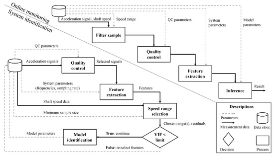The algorithm consists of separate identification and monitoring procedures, which are illustrated in the flowcharts in Figure 2. The algorithm uses acceleration signals from selected measurement positions with the associated sampling rate and rotational speed of the shaft. The parameters used by the algorithm include user-defined and system-specific parameters and parameters identified from the training data. The parameters are summarized in Table 2 and explored more in the following sections.