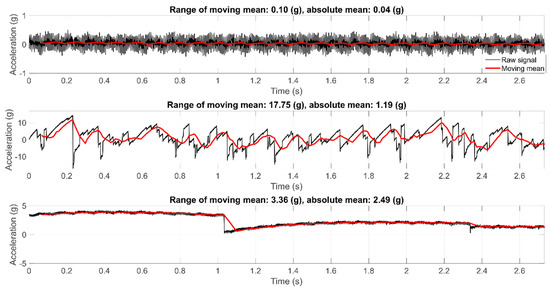 In this study, the range limit for the moving average was set 0.5 × 9.81 m/s2 (or 0.5 g) in the moving windows of 100 data points. The window size should be relatively large to avoid the rejection of signals with large impulses inflicted by defects. The limit for the absolute mean was set 2 g but a lower limit could be preferable in the practical application with a lot of data. In the signal processing stages that follow quality control, the mean must be subtracted from the accepted signals in order to obtain commensurable values in feature extraction.