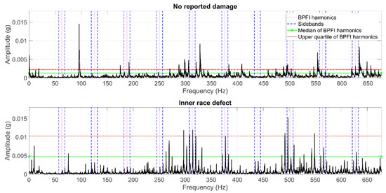 Amplitude spectra of thruster 1 with shaft speed 346.96 rpm. The upper plot shows a case without reported damage and the lower plot shows a case where the inner race of pinion shaft support bearing was damaged. The median and upper quartile of the amplitudes of 1–10 harmonics of BPFI are shown.