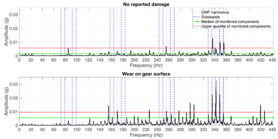 Amplitude spectra of thruster 2 with shaft rotational speed 394.13 rpm. The upper plot shows a case without reported damage and the lower plot shows a case where wear on pinion and wheel gear surfaces was confirmed. The median and upper quartile of 20 amplitudes including the values of 1–4 harmonics and sidebands of gear mesh frequency are shown.