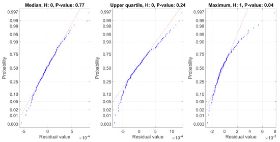 Normal probability plots demonstrating the effect of quantiles in the distribution of residual values. The plot on the left shows the residual of feature no. 4 (median), whereas the upper quartile is shown in the middle and maximum is shown on the right. The parameter H (0 or 1) is the hypothesis result from Kolmogorov-Smirnov test at the 5% significance level.
