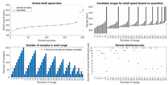 To select the appropriate shaft speed ranges for condition monitoring, statistical tests for normal distribution are included in the identification stage in the algorithm. Firstly, the samples in training data are sorted in the order of magnitude based on the shaft speed. Then, specific quantiles are computed from them which is illustrated in the upper left plot in Figure 7. In this study, the quantiles were the deciles and the zeroth quantile (minimum).