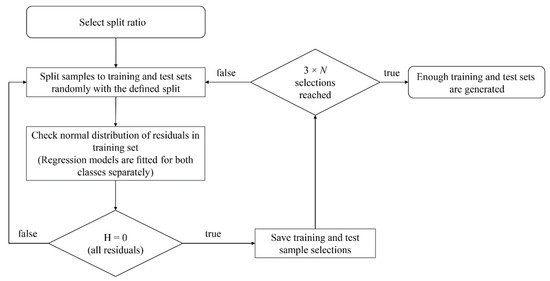 The residual values for each feature are calculated in each range where the sample size is above the defined limit by using Equation (3). A statistical test for normal distribution is then done on each set of residual values separately assuming they are independent data sets. The one-sample Kolmogorov-Smirnov test was used in this study. It is a nonparametric test to evaluate if the empirical cumulative distribution of the data is equal to the hypothetical cumulative distribution [41]. The applied statistic is the maximum absolute difference between the empirical Cumulative Distribution Function (CDF) calculated from the data vector x and the hypothesized CDF