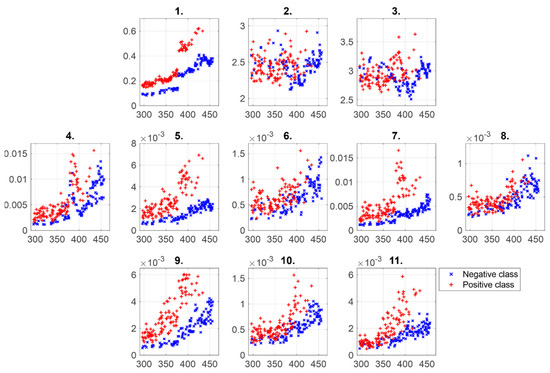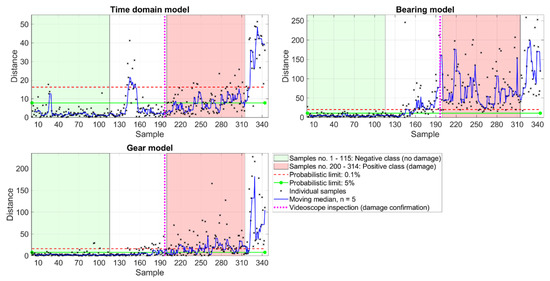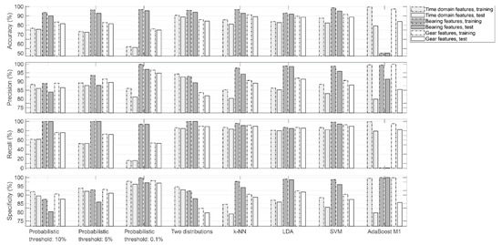 The features should have the capability to indicate the symptoms of defects individually or together. The symptoms can sometimes be enhanced with various signal processing techniques [21,31] and the features that reveal changes together could be selected based on some search algorithm [32] that optimizes the prediction accuracy. However, the computationally optimized signal processing parameters [33] and features [34] are prone to become case-dependent to the data sets analyzed, and then, the selections may not be useful for other data sets. In practical applications, the new data may reflect new symptoms which are not known by the models trained [10,35].