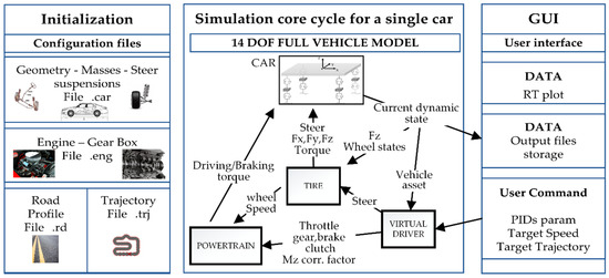 Figure 1 depicts the proposed modular architecture. The simulation starts by instantiating one or more vehicle objects. Each vehicle is created as an independent instance of the same abstract object class, which relies on several interacting sub-objects such as the car, tyre, powertrain, or driver sub-modules. Each vehicle instance retrieves the information required for its own construction, using a set of specific configuration files. Different configuration files define the required vehicle properties such as car geometry, inertial parameters, masses, steering system, engine, tyres, and suspension characteristics. Each of the input files must obey a prescribed syntax format, although OOP would also allow the easy implementation of the possibility of supporting different input file syntaxes.