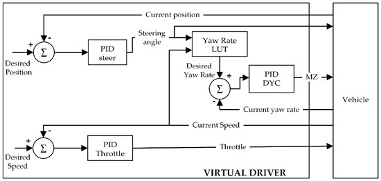 The driver sub-module of the simulation software is used to control the throttle position, the steering wheel angle, and the Mz correction factor using three nested PID regulators as described in [40,41] and depicted in Figure 2. A kinematic model is implemented to derive the steering angle at wheels, based on the actual value of the steering input given by the virtual driver and on the steering ratio.