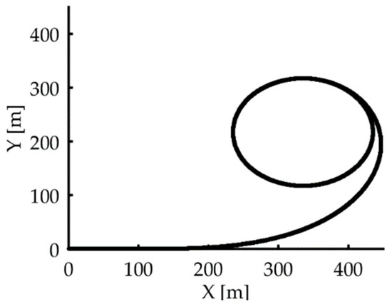 In the implemented CR manoeuvre, the two vehicles are driven by virtual PID-controlled drivers at different speeds along the trajectory shown in Figure 3, consisting of a clothoid, along which the vehicles are accelerated until reaching a speed of 30 km/h, followed by a circular trajectory of standard constant radius, R, equal to 100 m. At that point, the steering angle is increased up to the value of the Ackerman angle, which is calculated, for the test vehicles with a wheelbase L = 2.73 m, as