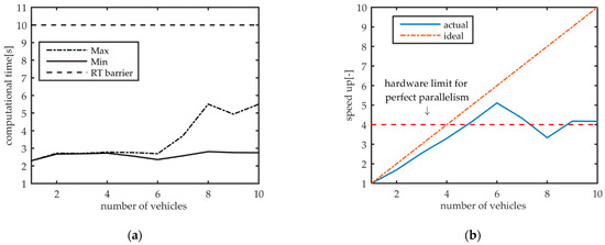 Figure 6a shows the trend of minimum and maximum computation times required when issuing an increasing number of parallel simulations. The almost constant value of the minimum curve tells us that there is always at least one thread, thus at least one parallel simulation, able to conclude the job with a performance comparable to the single-vehicle simulation case. Conversely, a sever degradation of the slowest thread performances happens only from above six concurrently simulated vehicles. This suggests that the computational resources within the used workstation are saturated only when we launch more than six concurrent threads: in all those cases, only a subset of the threads are able to stay resident on the CPU, while the remaining threads’ operations start to be scheduled asynchronously. Although the computational efficiency is out of the scope of this paper, it is worth noticing also that all the simulations were completed within the real-time barrier, showing great potential for achieving parallel real-time simulation of several vehicles.