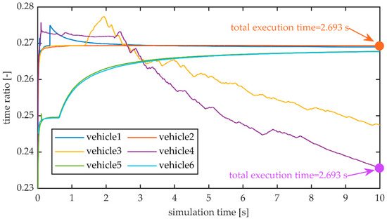 Figure 7 further clarifies the implication of concurrent execution of six identical vehicles, all performing the same CR driving test task for 10 s, showing the evolution of the time ratio between the software execution time, (texec), and the vehicle time, tsim, calculated as follows: