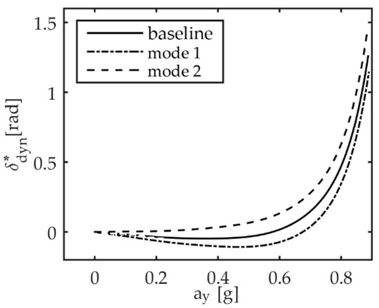 Figure 8 shows the dynamic steering angle curve, as a function of the lateral acceleration, ay, for vehicle 1 (baseline) along with the desired curves for vehicle 2 (mode 1 and mode 2) when the vehicle speed is set to 25 m/s and a ramp signal is used to define the steering wheel input between 0° and 120° [43]. Vehicle 1 shows an oversteering behaviour for lateral acceleration values up to 5.5 m/s2. Thanks to DYC, vehicle 2 in mode 1 shows an oversteering behaviour up to 6.5 m/s2 of lateral acceleration, while an understeering behaviour is achieved by vehicle 2 in mode 2 in the entire range of lateral acceleration.