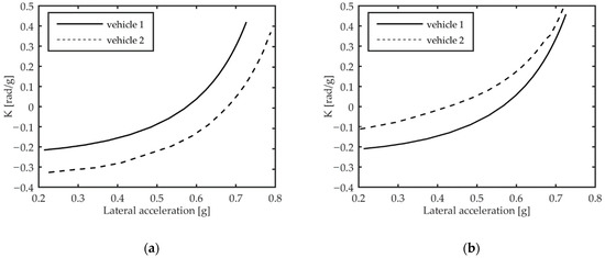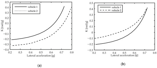 Understeer gradient estimated by implementing the CR test for vehicle 1 and for vehicle 2 in driving mode 1 (a) and in driving mode 2 (b).