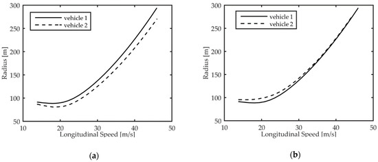 Turning radius as a function of the longitudinal speed for vehicle 2 in both driving mode 1 (a) and in driving mode 2 (b), as compared to vehicle 1.