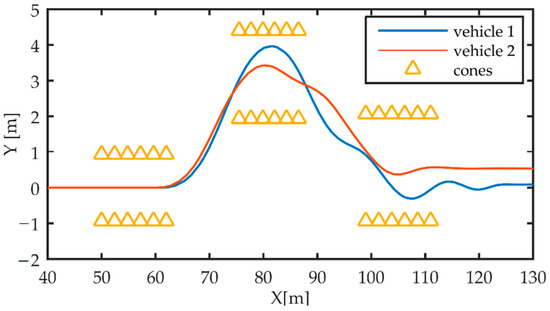 Figure 12 shows the paths followed by the centres of gravity (CGs) of vehicle 1 and vehicle 2, along with the desired path during the manoeuvre. Considering the track dimensions defined in Table 2 and a vehicle width of 1.4673 m for Section 3 and Section 5 of the test track, the maximum allowed absolute values of the position error are 0.5 and 0.76 m, respectively. Vehicle 2, subject to DYC in driving mode 1, proves able to correctly complete the manoeuvre, with a maximum position error of about 0.12 m. This is due to the higher level of oversteer that makes vehicle 2 more responsive to the driver’s steering input, allowing it to travel on a path with a lower-curvature radius than vehicle 1 at the same speed.