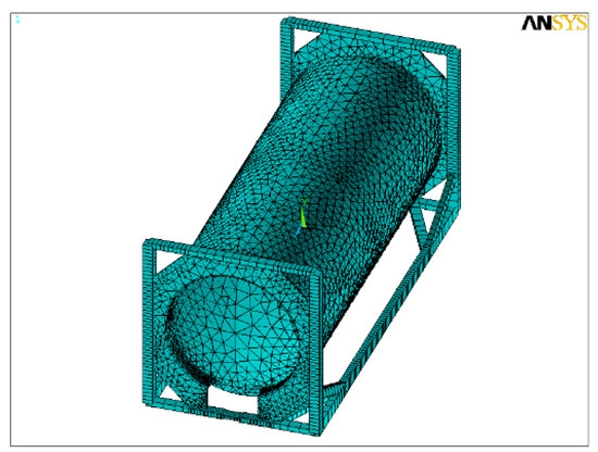 Once the geometric model was realized, the “mesh” was performed. The generation of the mesh was realized according to the “free meshing” method, but it was suitably thickened in the connection area between frame and tank where more precise results are desired (Figure 2).