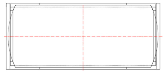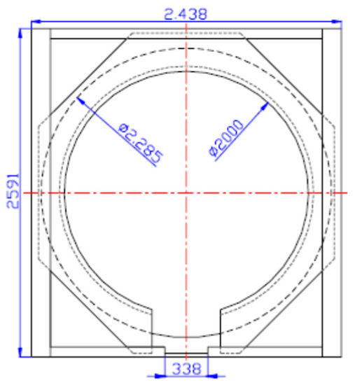 The two octagonal end plates have a central hole with a diameter of 2 m and a thickness of 20 mm. At the end frame and to the skirt are welded, which in turn has an internal diameter of just over 2 m (that is, with the space required to perform the welding with the plate) and a thickness of 45 mm; both are made of “EN10210/S355” steel. The tare weight of the tank container is about 4600 kg, and the dimensions of the different elements that form the tank container are reported in Figure 3, Figure 4 and Figure 5.