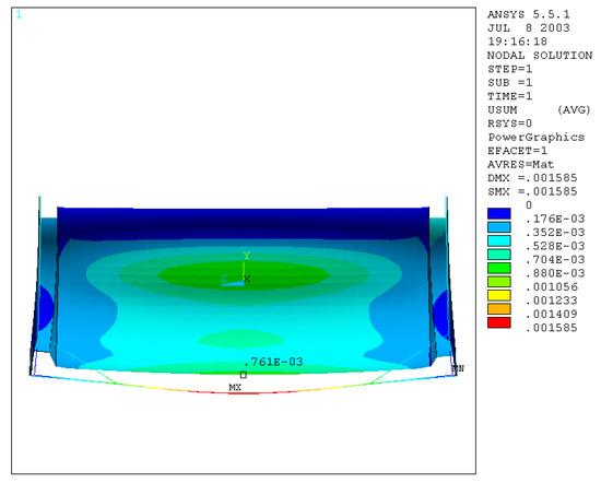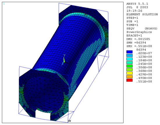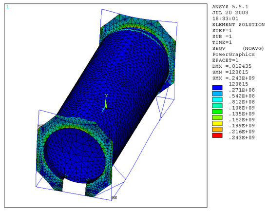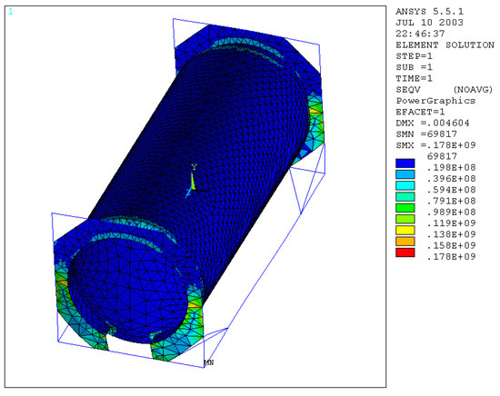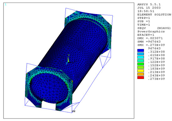 Reducing the thickness of the plate and the skirt by 5 mm, we obtain that the value of the maximum equivalent stress increases up to a value of 0.218 × 109 N/m2 (Figure 21), as well as the normal and bending stress.