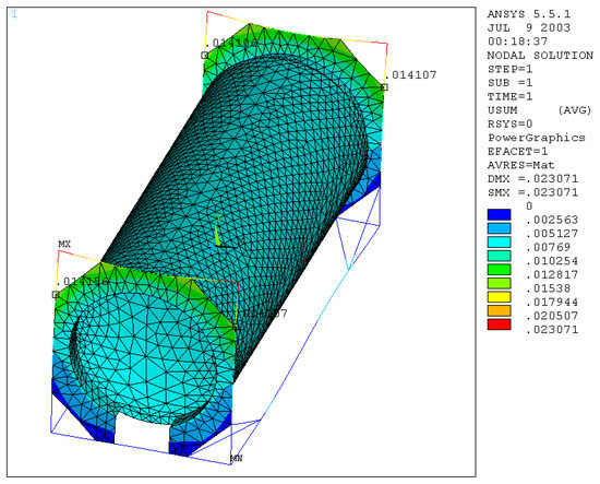 The 3D model of the tank container was realized by mean the “Solid Works” program, and it was subsequently imported, as an IGES file, into the “ANSYS R17” program code to perform the numerical simulations. Only one-eighth of the model was designed and then reflected to generate the entire model, on which we reported the few asymmetries geometric. To model the considered geometry, we used the “beam4” elements for the frame and the “shell63” elements for the tank, the octagonal plate, and the skirt; by doing so, it was possible to “mesh” the whole model by reducing the total number of elements used [28,29,30]. The model, shown in Figure 1, was examined, considering it substantially made up of four basic elements:
