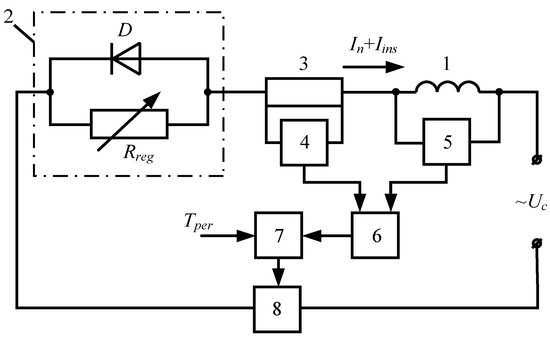 A schematic block diagram of a thermal protection device generating an instrumental current from the operating AC: 1, thermal sensor; 2, DC input block; 3, measuring shunt; 4, block for measuring the value of the instrumental DC ; 5, block for measuring the value of voltage drop on the temperature sensor caused by the current ; 6, computing block; 7, threshold switch; and 8, executive unit.