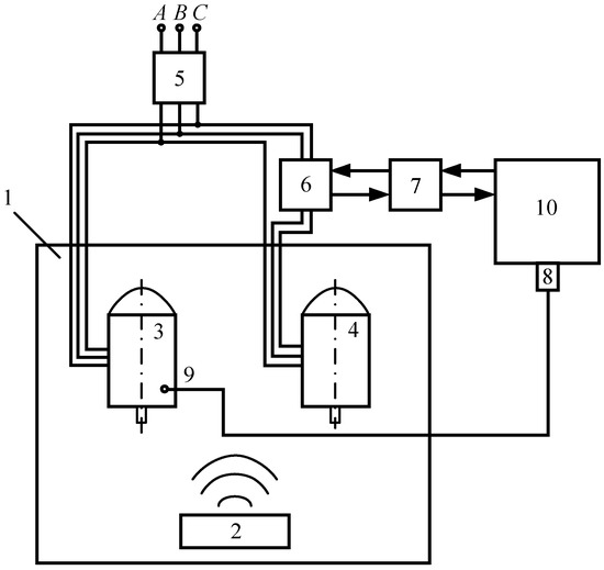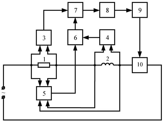 A schematic block diagram of a thermal protection device with the procedure for extracting DC components from alternating phased voltages and currents: 1, measuring shunt; 2, winding–stator temperature sensor; 3, 4, and 5, the first, second, and third recording blocks; 6 and 7, primary and secondary computing blocks; 8, block for recording the winding 2 temperature; 9, comparison block; and 10, executive unit.
