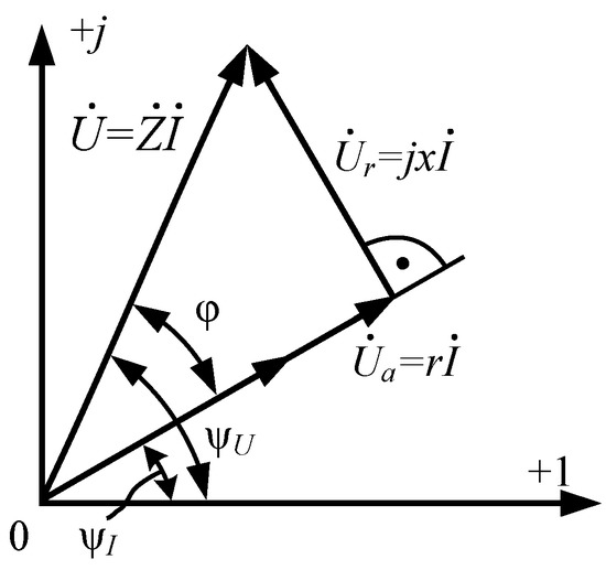 From Equations (5) and (11), it is evident that, to solve the problem, i.e., to control the EM SW temperature, it is enough to register the state of the phase difference between vectors and . Using the synchronization of signal processing via the phase of the current in an unbranched circuit, it is possible to use the equipment to register the effective values of the quadrature and in-phase supply voltage components and, therefore, to obtain the current value of in order to provide EM thermal protection. In fact, we are talking about the possibility of implementing a new phase control method for EM SW temperature.