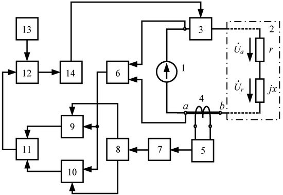 The recording blocks 3 and 4 are presented as amplitude detectors, and the third recording block (block 5) is presented as a phase detector. The first computing block 6 is an analogue signal multiplier, and the second computing block 7 is an analogue divider of two signals. The registering block 3 generates as an output an electrical signal proportional to the amplitude value of the current in the circuit. Block 5 generates an electrical signal proportional to . Block 6 multiplies electrical signals fed from blocks 5 and 4; this results in an output electrical signal, which is proportional to the amplitude value of the active component of the voltage drop on the resistance of the winding 2. Block 7 runs an analogue calculation of the current value of the winding 2 resistance and, thus taking into account Equation (1), runs algorithmic determination of its temperature. Block 9 runs a comparison procedure for this temperature value against the permissible heating value and, if necessary, sends a signal to the executive unit 10.