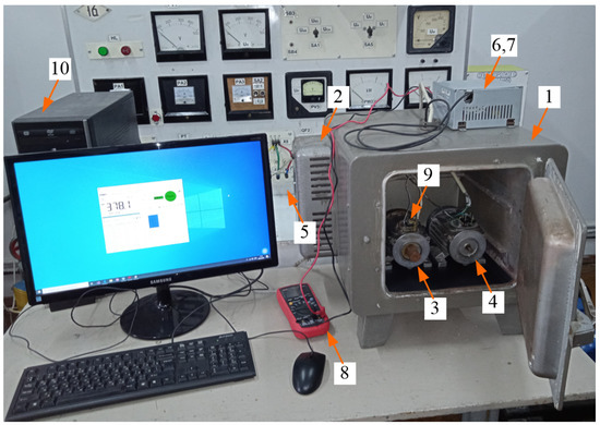 General view of the test bench: 1, test chamber; 2, adjustable air heater; 3, base EM; 4, tested EM; 5, power switch; 6, EM thermal protection device, which implements a new phase control method for EM SW temperature; 7, data collection system E502 manufactured by “LKard” (Moscow, Russian Federation), 8, miniature electronic thermometer (MET) with a remote digital temperature sensor 9; and 10, personal computer (PC).