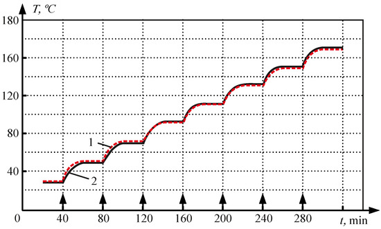It should be noted that, on average, the EM SW temperature reached a steady-state value within ≈20 min after turning on the heater. Therefore, multiple temperature measurements were carried out during each step of the heater temperature change, including during the steady-state temperature regime of the electric motor. For each subsequent time interval of the experiment, the processes of changing the temperature and measuring the SW steady-state temperature values of the corresponding electric motors were cyclically reproduced.