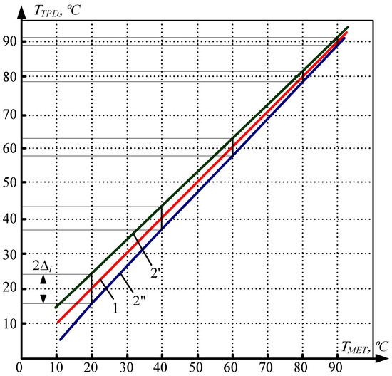 The results from determining the temperature measurement error by the phase method: TTPD is the EM SW overtemperature recorded by the EM thermal protection device; TMET is the overtemperature measured with a miniature electronic thermometer MET; 1, a diagram corresponding to the ideal case when the accuracy parameters of the indirect phase measurement method by means of the EM thermal protection device fully correspond to the accuracy parameters of the direct measurement method by means of MET; 2′ and 2″, diagrams of maximum deviations of the SW temperature of the test EM, reflecting the results of multiple measurements of the test EM by the thermal protection device; and 2Δi, range spread of SW overtemperature in the test EM as measured by the EM thermal protection device.