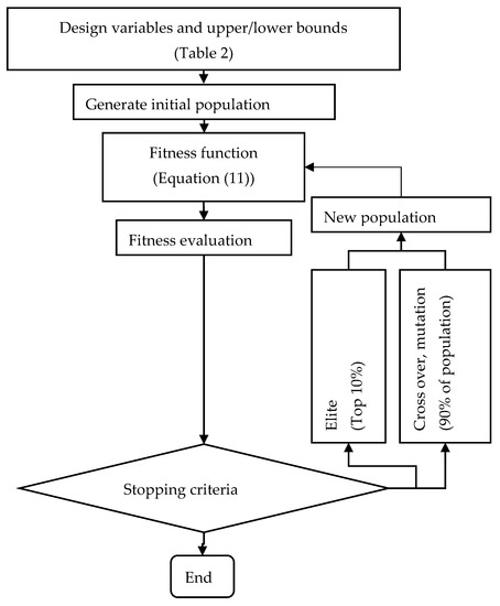 Once the unknown coefficients of Equation (11) were found through RSM, it was used as an objective function for the multi-objective genetic algorithm (MOGA) [11]. For the current optimization process, Equation (11) was solved through RSM for shaft power, hydraulic efficiency, volumetric efficiency, and pump efficiency. For the optimization process, pump power was a constraint designated to be minimized, while hydraulic, volumetric, and pump efficiency were constraints to be maximized, as shown in Table 5. MOGA is based on the stochastic method and utilizes the principle of survival of the fittest [16]. The genetic algorithm is initialized through a random population of selected sizes based on the opted design variables that define the first generation. Every individual from the population is tested against the defined fitness function. In this process, each generation’s population gets improved through an iterative process using mutation, crossover, and elite selection. A schematic of the process is shown in Figure 2. Population size for the current study was selected as 100 combinations of the defined variables. The crossover fraction and mutation fraction values for the current problem were chosen as 0.9 and 0.01. A 10% elite of the total population was carried out as the next generation unchanged.