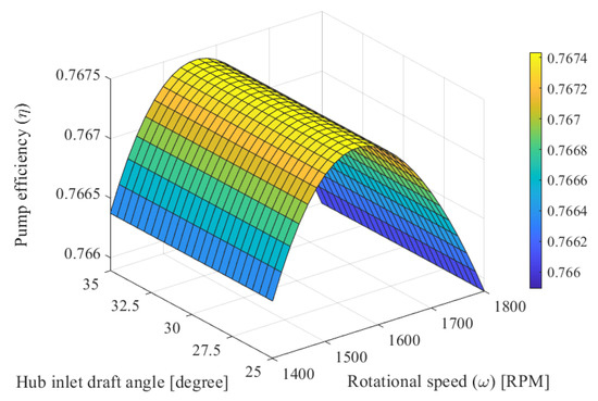 Figure 3 shows a variation of pump efficiency with rotational speed and hub draft angle. It can be observed that the effects of rotational speed on the pump efficiency are significant, but the hub draft angle has a minimum impact. It can also be noted that pump efficiency increases with the increase of the rotational speed, and then it starts decreasing after attaining a maximum value. A similar phenomenon was observed for all the hub inlet draft angles.