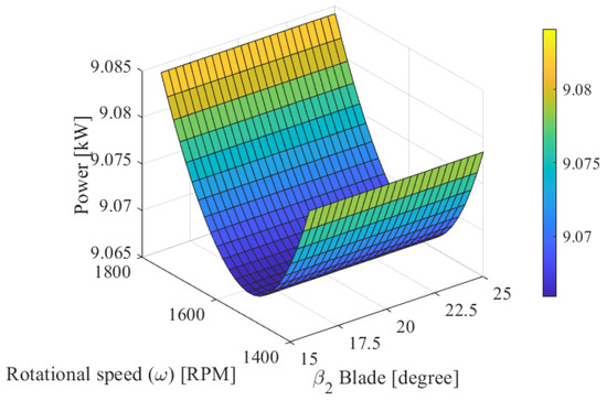 On the other hand, Figure 4 shows a graph between shaft power, the blade angle beta, and the impeller’s rotational speed. It could also be depicted from Figure 4 that the count of vanes has a minimal impact on the power required to run the pump, and again, the shaft power varies significantly with the pump’s rotational speed. An increase in impeller rpm from 1400 to 1533 leads to a decrease in impeller power, but a further increase in rotational speed from 1533 to 1800 increases the pump’s required power. Table 6 shows the optimized parameter based on response surface optimization. A geometric comparison between base geometry and optimized geometry is shown in Figure 5.