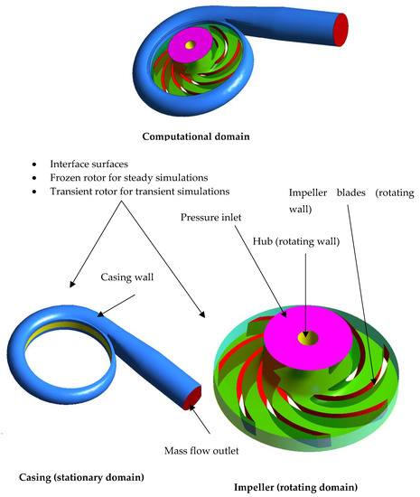 The current investigation, impeller, pump, and casing form the computational domain, as shown in Figure 6. Impeller geometry and the hub are modeled as a rotating domain that revolves at 1533 rpm, while the shroud is modeled as a stationary wall. On the other hand, the casing has been modeled as a stationary domain. The frozen rotor has been modeled as an interface between the impeller domain and casing domain for steady-state cases. In contrast, a transient stage interface type is implemented for unsteady simulations. At the inlet of the impeller, the total pressure boundary condition has been imposed, while the mass flow condition has been imposed on the outlet of the casing. Four different flow rates were used, i.e., and. Here, is the volume flow rate while is the flow rate equivalent to the pump’s maximum efficiency, i.e., the point for which the rotor has been optimized. A volume concentration of 20% has been used for all the flow rates. Details of the simulations and particle distribution are listed in Table 7. On this account, four sets of steady simulations were conducted with different flow rates.