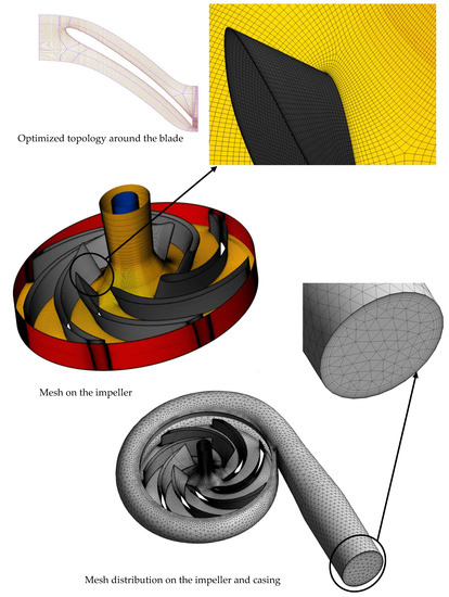 Structured mesh using hexahedral elements was generated for the impeller domain, while unstructured mesh was created for the stationary domain (volute casing). ANSYS TurboGrid was utilized to develop the structured mesh for the impeller domain with controlled topology. Meshes for the impeller domain and casing domain and the topology of the mesh are shown in Figure 7. The O-grid around the blade was constructed to capture the boundary layer accurately.