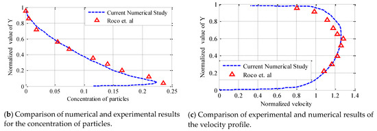 Validation of the existing numerical model was completed by assessing the numerical model results utilized in the current study with the experimental research available in [44]. Experimental results introduced in [44] were acquired for a channel flow problem. Dimensions of the channel used were The geometrical model of the channel and mesh distribution is shown in Figure 3. Particles used for the study have an average diameter of and density of . The volume concentration of the particles at the inlet of the domain was , while average velocity at the inlet of the domain of the fluid was . The same geometry (Figure 8a) and other properties mentioned above used by [44] were implemented for the numerical model discussed above, and a comparison of the results is shown in Figure 8b,c. Figure 8b,c compare the concentration of particles and velocity profile for experimental results and results produced by the current numerical model. The comparison study shows that both works are in close agreement, and the present numerical model could predict erosion rate. The same validation procedure has been adopted in the literature as well by [29].