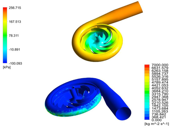 Pressure and erosion rate density contours on the walls of the impeller and casing walls.