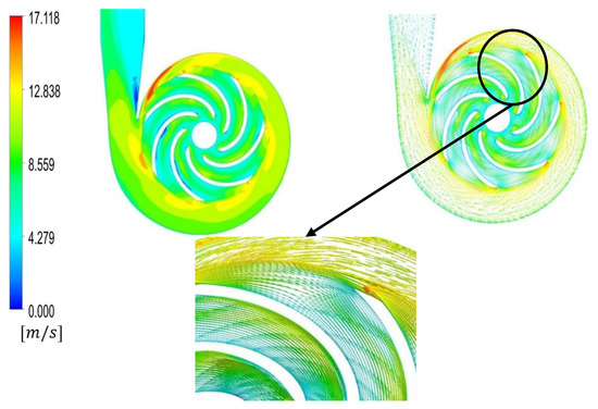 In contrast, Figure 10 shows contours and velocity vectors plotted on a turbo surface generated at the 50% span. It could be seen qualitatively in Figure 9 that erosion rate density is much higher at the casing than the erosion rates on the blades of the pump. It can be observed from velocity contours and vectors in Figure 10 that maximum velocity appears to be concentrated near the pump casing. In contrast, the velocities’ magnitudes are comparatively low in the flow region near the blades of the impeller. This is why higher erosion rate density can be observed in the casing region and not on the blades of the impeller.