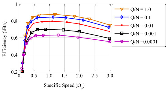 Characteristic maps of the centrifugal pump were generated using 45 simulations at different values of and specific speed. Five curves were plotted to complete the characteristic maps for the pump using values of being 1.0, 0.1, 0.01, 0.001, and 0.001, where is the volume flow rate term and is the specific speed term. The relation between and is given in the equation below. Each curve was plotted using the results from nine simulations, as shown in Figure 11. It could be seen from Figure 11 that at specific speed values under 0.25, the efficiency of the pump is exceedingly small. Although, efficiency starts rising rapidly as specific speed rises above 0.25. As soon as specific speed approaches 0.5, efficiency increases faintly for a specific speed range from 0.5 to 1.0. Efficiency is maximum at a specific speed for all the curves. Moreover, for a specific speed range of 0.5 to 3.0, efficiency of the pump decreases for the curves at different values of
