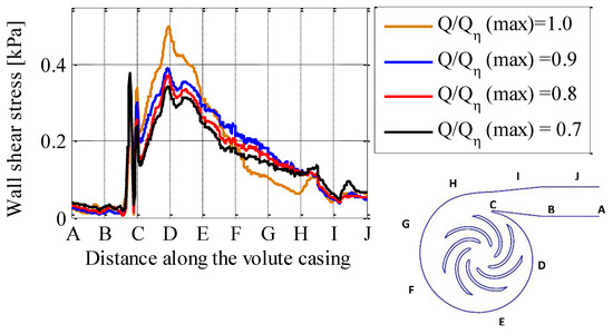 Variation of wall shear stress along the walls of the pump casing at different flow rates.